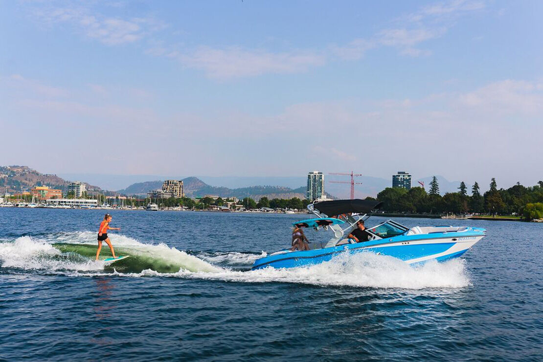 Another popular choice for water sports in Kelowna is wakeboarding—get towed and criss-cross the waves. It’s like snowboarding on water. Catch some air if you want! Don’t have a wakeboard? At Downtown Marina, we’ve got top-of-the-line wakeboard rental options, so there’s no need to worry. Our high-end MasterCraft wakeboard boats are brilliant for creating world-class surf waves. These boats seat up to sixteen people; whether your party consists of kids who can’t contain their excitement or pros with tricks lined up, everyone gets a turn!